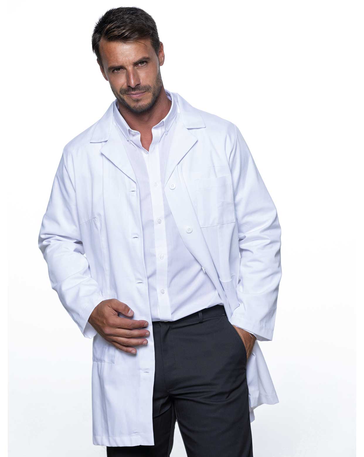 Bata de hombre. Cuello en V. Bolsillo en el pecho en el lado izquierdo y dos bolsillos delanteros en la parte inferior. Cinco botones frontales a tono. Cinturón en espalda.